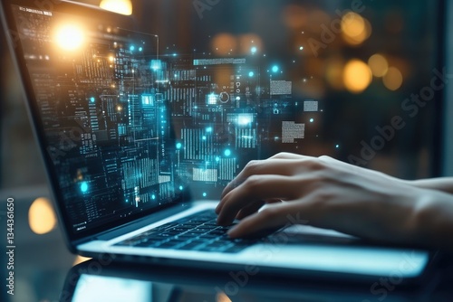 Hands typing on laptop, data visualization overlay