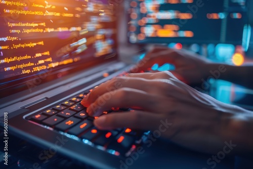 Hands typing on laptop keyboard, screen displaying code. Programmer working on computer in dark room with colorful lights.