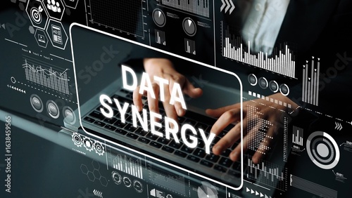 Hands Typing on Laptop with Data Visualization and Analytics Graphics Representing Data Synergy in Business Environment. Asymptotic smart data analytic.