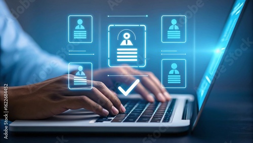 Hands typing on laptop with digital profile icons computer