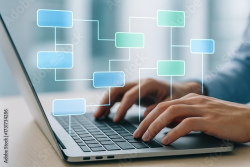 Hands Typing on Laptop with Flowchart Graphics in Modern Office Environment