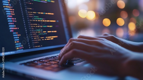 Hands typing on laptop with programming code on screen, representing software development. Perfect for coding, IT solu