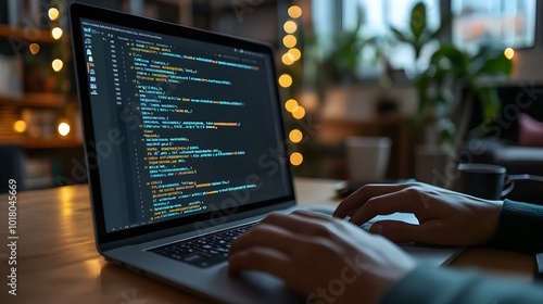 Hands typing on laptop with programming code on screen, representing software development. Perfect for coding, IT solutions, digital technology, web applications.