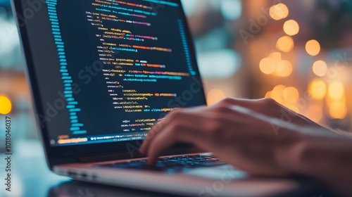 Hands typing on laptop with programming code on screen, representing software development. Perfect for coding, IT solutions, digital technology, web applications.