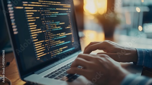 Hands typing on laptop with programming code on screen, representing software development. Perfect for coding, IT solutions, digital technology, web applications.