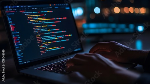 Hands typing on laptop with programming code on screen, representing software development. Perfect for coding, IT solutions, digital technology, web applications.