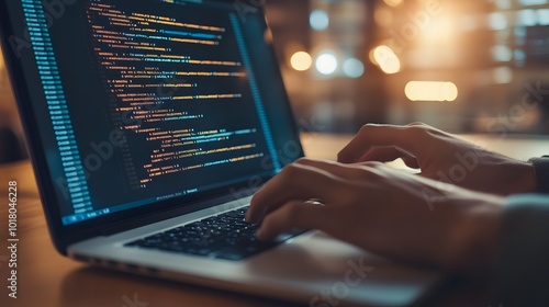 Hands typing on laptop with programming code on screen, representing software development. Perfect for coding, IT solutions, digital technology, web applications.