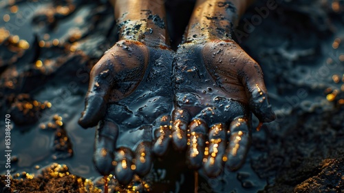 Hands wet from crude oil against the background of spilled petroleum products. Crisis of the oil industry. Economic recession. Black gold.