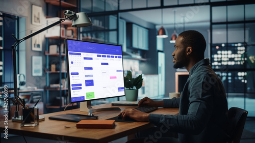 Handsome Black African American Specialist Working on Desktop Computer in Creative Home Living Room. Freelance Male is Checking His Calendar to Make an Appointment with New Clients and Employer.