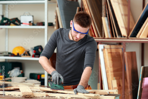 Handsome young carpenter in workshop