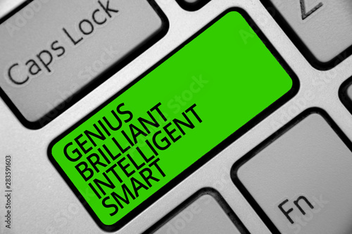 Handwriting text Genius Brilliant Intelligent Smart. Concept meaning Clever Bright Knowledge Intelligence Keyboard green key Intention create computer computing reflection document