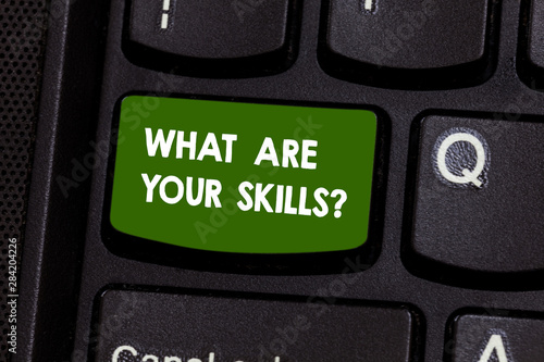 Handwriting text writing What Are Your Skillsquestion. Concept meaning Tell us your abilities knowledge experience Keyboard key Intention to create computer message pressing keypad idea