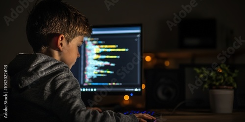 happy Abstract Design Featuring a Young Boy Coding on a Computer, Symbolizing the Future of Tech-Savvy Youth, Educational Innovation, and the Joy of Learning Programming Skills, Ideal for AI-Genera