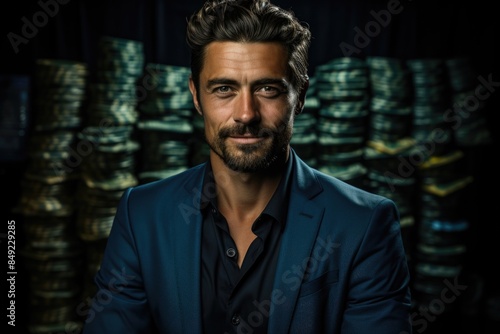 Happy and successful man smiling satisfied, holding money, standing on a blue back, generative IA