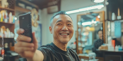 Happy Barber Capture: A Man's Smiling Selfie in a Barbershop