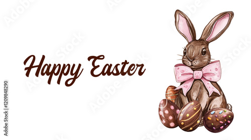 Happy Easter. Watercolor banner with chocolate sweet rabbit and Easter eggs. Easter sweets. Easter symbol. Easter illustration.