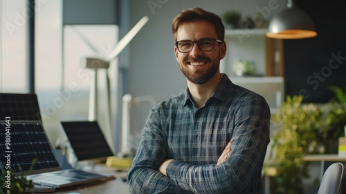 Happy engineer man in renewable energy sector, analyzing solar panels or wind turbine models, set in a workspace that reflects a commitment to sustainability and green technology.