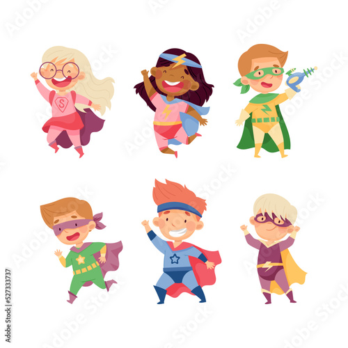 Happy Kids Wearing Costume of Superhero and Mask Pretending Having Power for Fighting Crime Vector Set