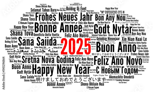 Happy New Year 2025 word cloud in different languages