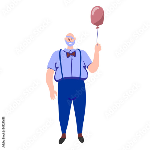 Happy pensioner in a shirt with a bow tie holds a pink balloon. An elderly, smiling man. Illustration in vector style.