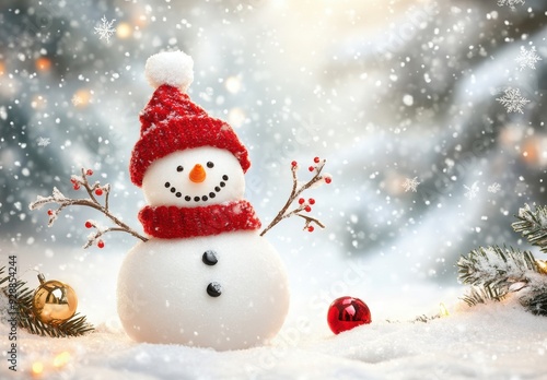 happy snowman character with branches and red hat in hand, standing on the white winter background
