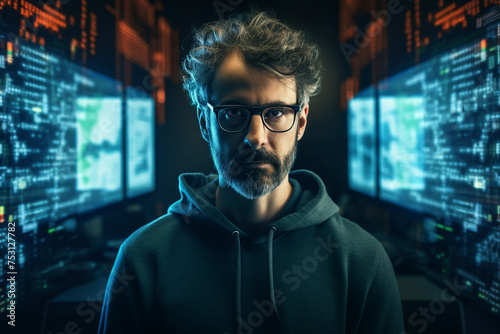 Hard working person in modern interior office programming writing web java script code AI technology generation