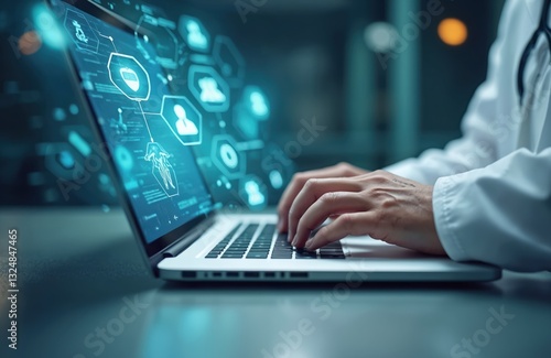 Healthcare pro types on laptop with medical icons interface. Doctor uses digital tech to access patient data, treatment planning software. Clinical analysis on screen, biotechnology research,