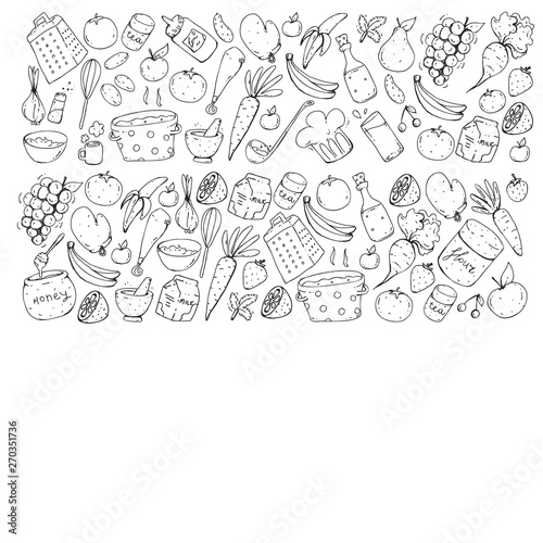 Healthy food and cooking. Fruits, vegetables, household. Doodle vector set.