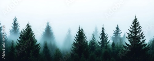 Heavy fog in a dense forest, silhouettes of trees barely visible, eerie and mysterious, [Weather], [Forest Enigma]