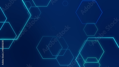 Hexagon geometric blue neon lights technology Hi-tech dark background. Abstract graphic digital future science concept design.