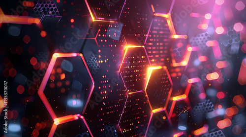 Hexagon Tech Abstract: A mesmerizing abstract background of glowing neon hexagons in vibrant shades of red and purple, creating a dynamic and futuristic feel, perfect for technology, innovation.