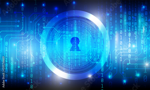 Hi Technology Key Hole Circle Panel Cyber Security Vector Background. Abstract Blue Circuit Board With Binary Digital Number Protection Code.