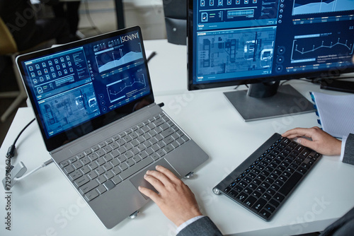 High angle closeup of professional IT security specialist using multiple computers with blue data on screen copy space