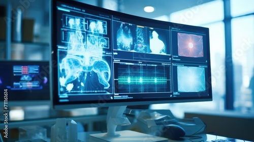 High angle view of a computer display showing realtime data and images from the AIassisted procedure in progress.