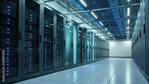 High tech data center with rows of servers and illuminated racks, showcasing advanced technology and secure data storage
