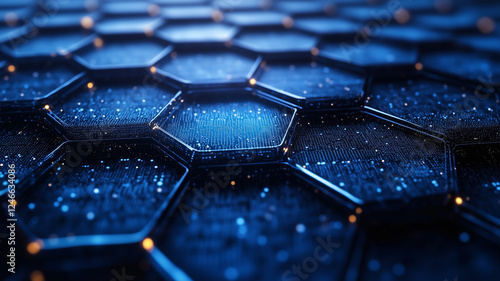 High tech hexagonal pattern with glowing elements and futuristic feel. This digital design showcases network of interconnected hexagons, creating visually striking surface
