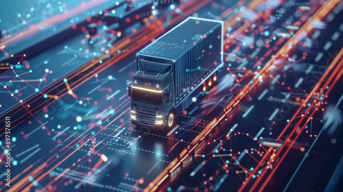 Highlight the use of advanced technologies such as IoT, AI, and blockchain in logistics, with digital interfaces showing real-time tracking and data analytics.