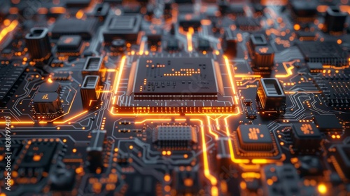 Highly detailed CPU with glowing circuits and electronic components, symbolizing advanced computing technology Futuristic, 3D illustration