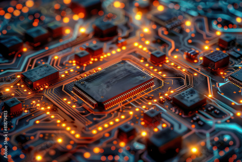 High-magnification of a computer processor chip, revealing intricate circuit patterns. Circuit Board CPU Processor Starting Digitalization Process and Information Computing. Generative AI