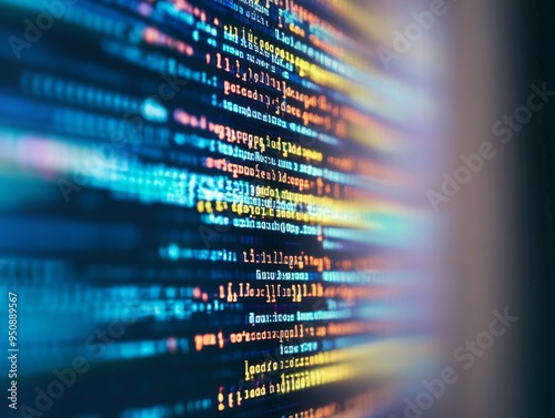 High-Resolution Abstract Background with Blurred Computer Code and Programming Language, Featuring Colorful Data Lines and Unobstructed Space for Text or Product Presentation