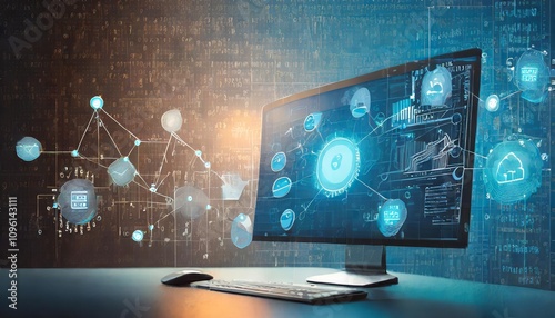 High-Resolution Computer Monitor Showcasing Business Process Automation Workflow with Advanced Analytics, Software Integrations, and Data-Driven Insights for Enhanced Operational Efficiency
