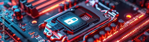 High-resolution image of a computer processor with a lock icon, representing cybersecurity, data protection, and secure technology.