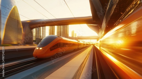 High-speed train departing modern city at sunset.