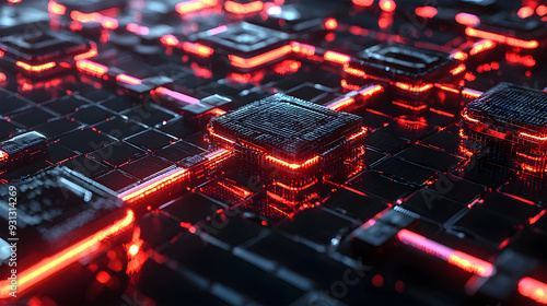 High-tech circuit board with illuminated red elements, showcasing modern technology and intricate design patterns.