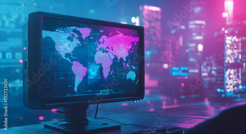 High-Tech Computer Display with Global Map Interface, AI GENERATIVE