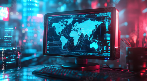 High-Tech Computer Display with Global Map Interface, AI GENERATIVE