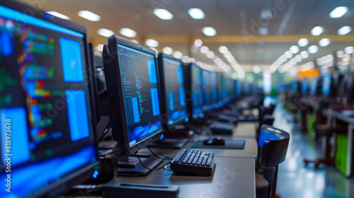 High-tech computer lab with multiple advanced workstations featuring large screens and coding data displayed, ideal for software development.