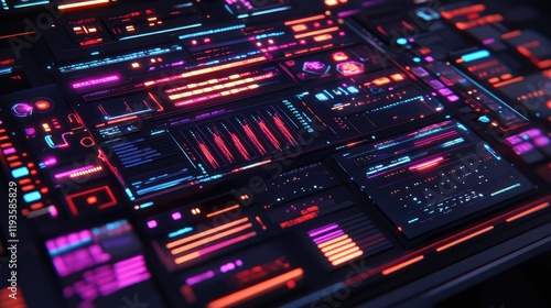 High-tech computing workstation with multi-screen setup, glowing interfaces, and futuristic coding algorithms