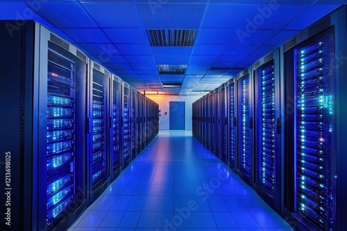 High-tech data center aisle with illuminated servers in blue lighting and a clean, organized layout