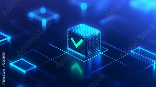 High-tech digital network concept with glowing checkmark square block symbolizing verification, data validation, and secure processing.